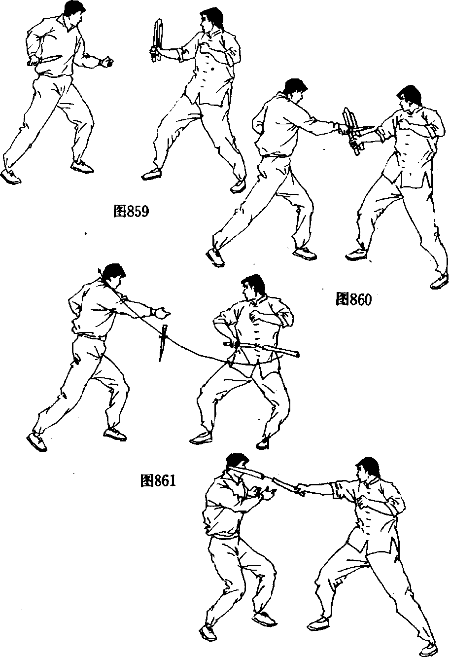 运用方法:由戒备势开始(图859),李小龙在等待对手先 发起攻击,当对手挥匕首攻来时,李小龙先用二节棍的前端去 猛击对手的手腕(图860),并将其匕首击落(图861);然后右 手将二节棍中的一节松开,并抽向对手的头部(图862),将其 击昏或击伤。