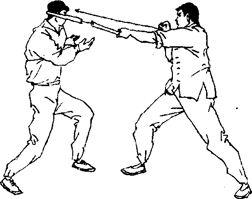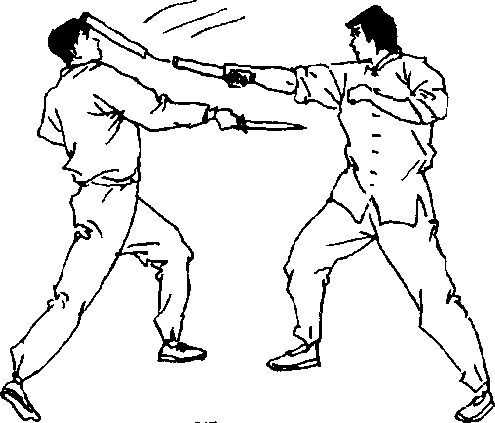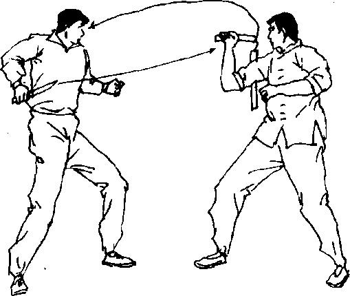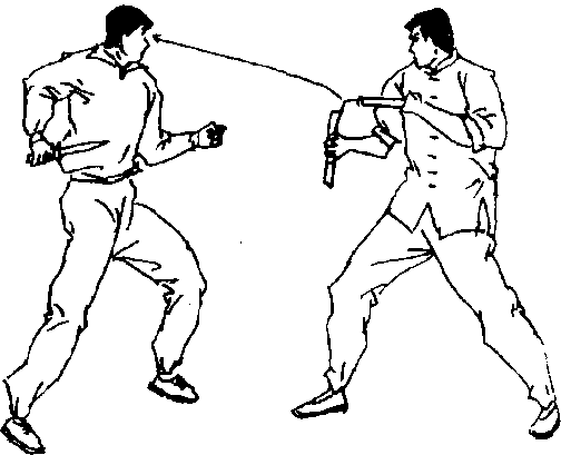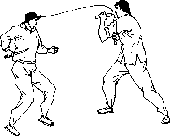 动作要领:攻击时,要将左手迅速松开,且使二节棍出其 不意的打击对手。身、步亦要协调有力,当然亦可配合叫喊声 去攻击对手。而且据李小龙所说,运用此招法时须有不畏强暴 的勇敢精神,即在精神和气势上要先压倒对手。否则,这套技 法即使练得再熟练,也是无济于事的。另外,为了迷惑对手,还 要不断地变换自己的步幅,且以娴熟的步法尽可能地逼近对 手进行致命反击,但须动作协调、快速、准确、及时,才可收制 敌之效。一个优秀的拳手常可由各个不同的角度进行攻击,并 能保持良好的平衡。此技法在攻击时无须做任何准备动作,它 只是拳心朝下,运用二节棍迅速打击对手的头部即可,因此可 谓技法简捷、实用、凶狠。