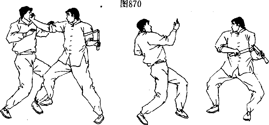 运用方法:当对手持刀或空手冲来时(图869),李小龙可 将置于臂后的二节棍迅速弹出,去攻击对手的面部要害(图 870),攻其以措手不及。然后,李小龙可再将右手反背拳连续 攻向对手头部(图871),将其击伤或击倒在地(图872) 0
