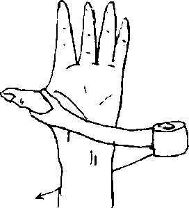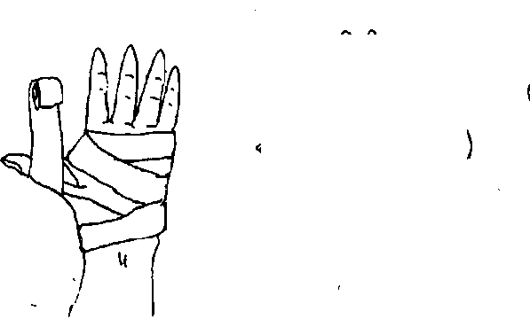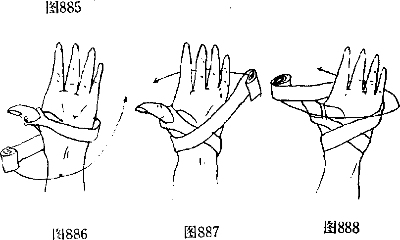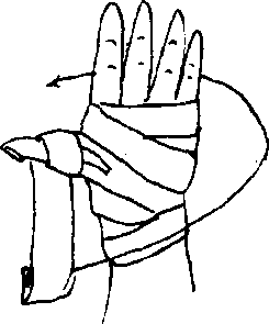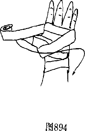 赛前大约30分钟,教练员应让拳 手做一套准备活动。助手应给拳手包 扎好护手绷带(图885、图886、图 887、图 888、图 889、图 890、图 891、图 892、图893、图894)。然后再给其戴上 拳套,但拳套和护手绷带均不可太松 或太紧,要使拳手舒适为度。