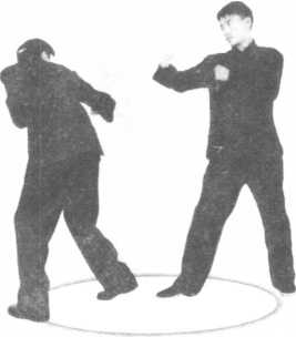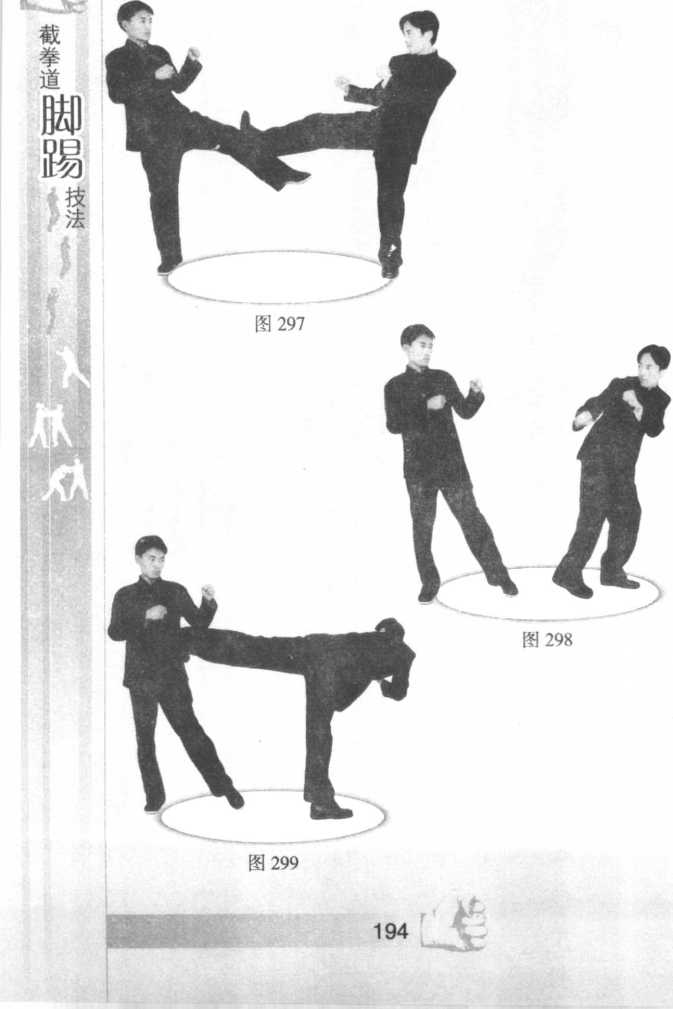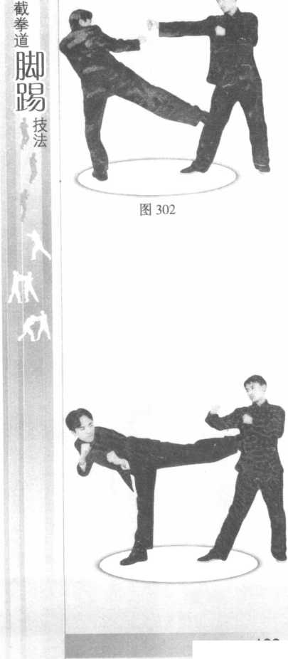 由警戒桩式起做旋 踢动作。对手以右脚在 前,并以前手攻击我方 面部。我方后退,同时 以前脚侧踢阻截对手的 攻击。对手收式时,未 等对手动作完成,我方 前进一步,把握距离, 前脚稳固支撑拧转,后 脚旋踢对手胸、腹部 (图 300~图 304 )o图304图303图305图305图306图306图307图307图305图305图306图306图307图307