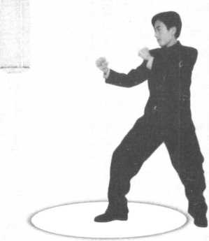 由警戒桩式起做摆踢动作。身体适度放松,保持警 觉,前脚为支撑腿,辗转踏地,在后脚即将前移的同时 提膝,拧转腰能摆扫踢出。然后迅速恢复警戒桩式(图