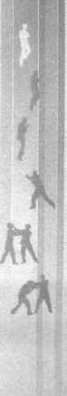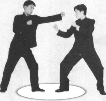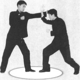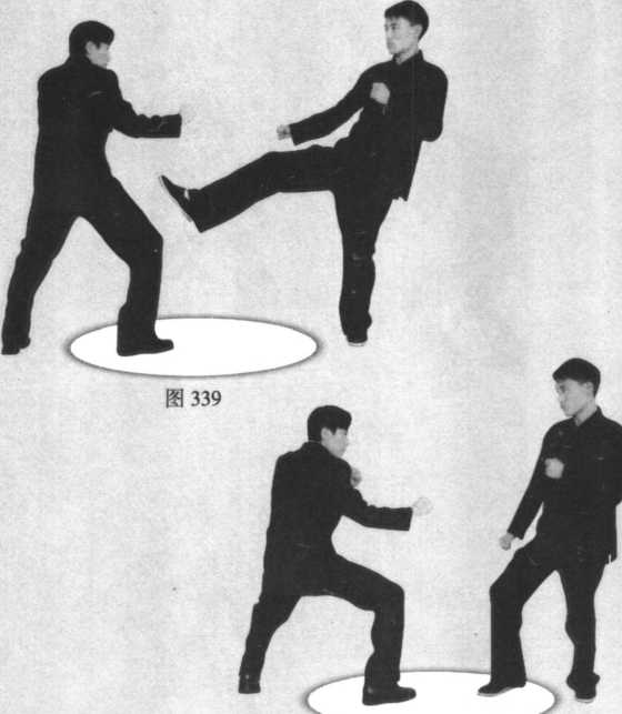 挥击我方头部。我方抬手阻挡,注意对手姿势变化,同时身 体快速下落,前脚快速扫击对手腿部(图335 ~图338 )。