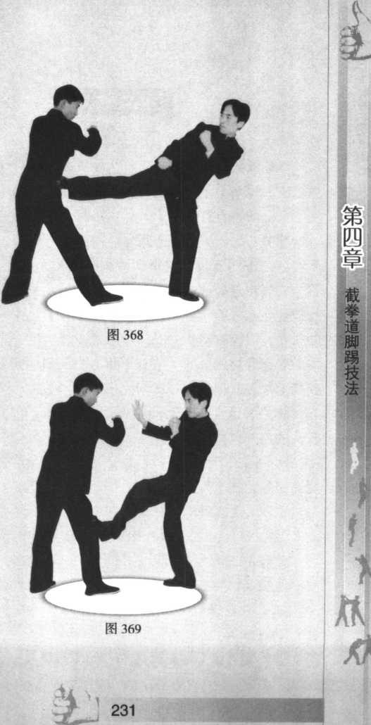 截拳道膝法的实战运用分为撞膝法和顶膝法。与其他 流派的膝技比较,其技术遵循截拳道的拳理,简捷、直 接、强劲,还可以配合战术或其他技法整体运用。它对练 习者的身体素质、精神状态、战术策略要求较严格。用膝 部攻击的目标为头、颈、太阳神经丛、腹、肋、裆、大腿 等部位。