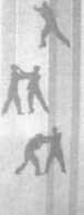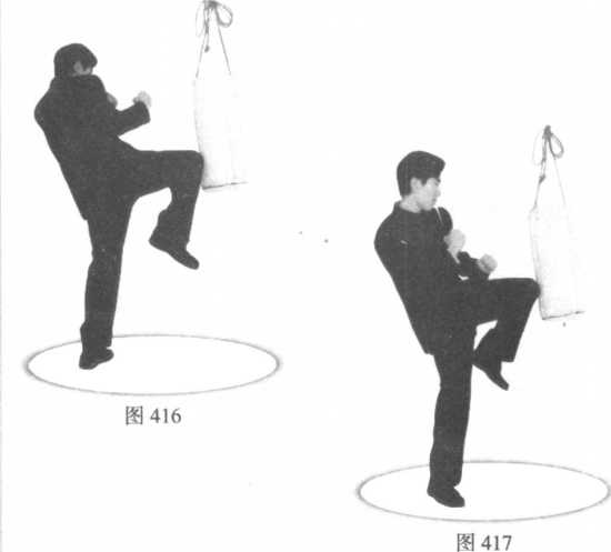 沙袋。由警戒桩式出膝顶击沙袋练习。磨练膝部关 节的肌腱、筋骨的坚韧与弹性,使膝部在长期训练顶撞 沙袋中变得坚硬,增强了攻击中出膝的硬度和劲力(图 415 ~图 417)。