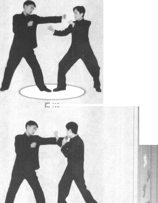 由警戒桩式起做顶膝动作。对手以左脚在前,并以前 手攻击我方面部。我方摇晃头部,闪过对手的直拳,并移 步接近对手,屈肘阻挡对手的攻击手臂,同时,前脚提