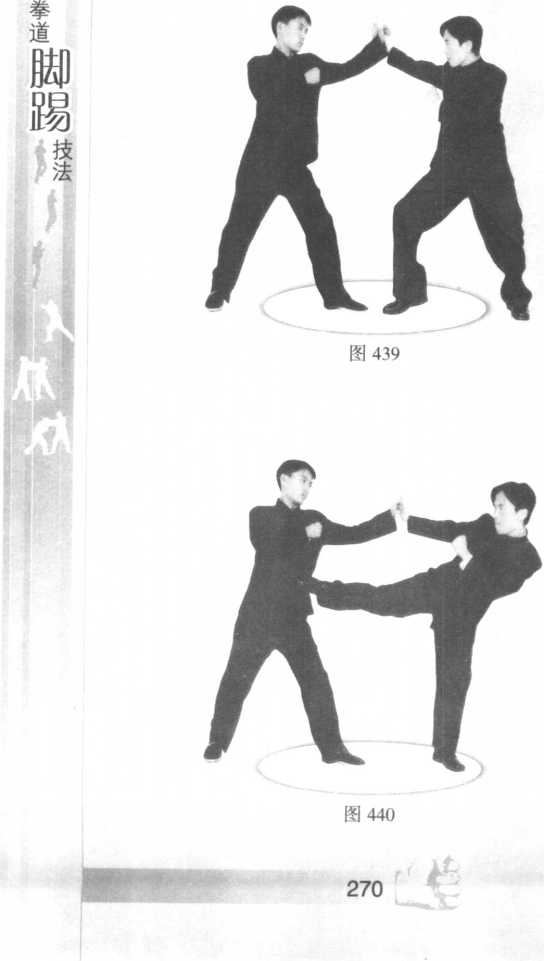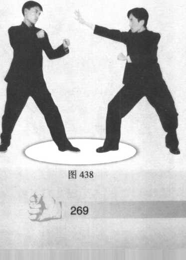 由警戒桩式起做假动作。对手以左脚在前,并以远距 离站立姿势。我方扬起前手分散对手注意力,迫使对手抬 臂进行防护,我方佯攻诱使对手暴露身体中段防护漏洞, 并快速上步以缩短对手与己的距离。当再前移一步靠近对 手时,已向对手身体左侧发起了攻击(图437 ~图440 )。