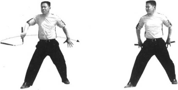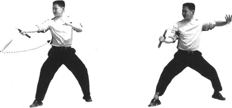 运棍手向体后扫击回棍,接棍手在运棍手的对角斜下方摊掌接棍。