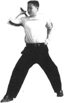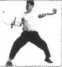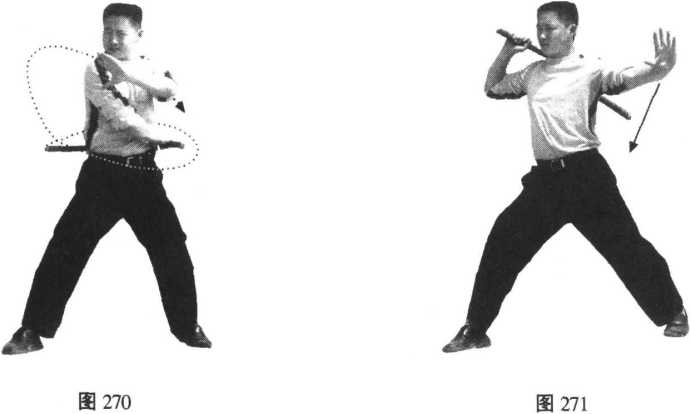 注 释:此套动作主要锻炼舞花连续劈击与单纯斜线劈击的相互转换,迅猛连贯的舞 花劈击在群战中可打开缺口,而单纯的斜线劈击则具有一击必杀的功效。此势即是两者的 有机结合和转换,如能熟练掌握,即可拥有混战中快速甩打而不误伤自身的能力。