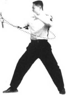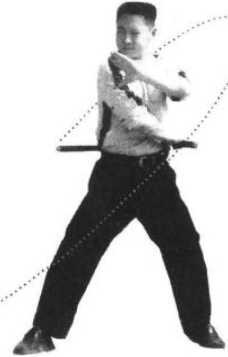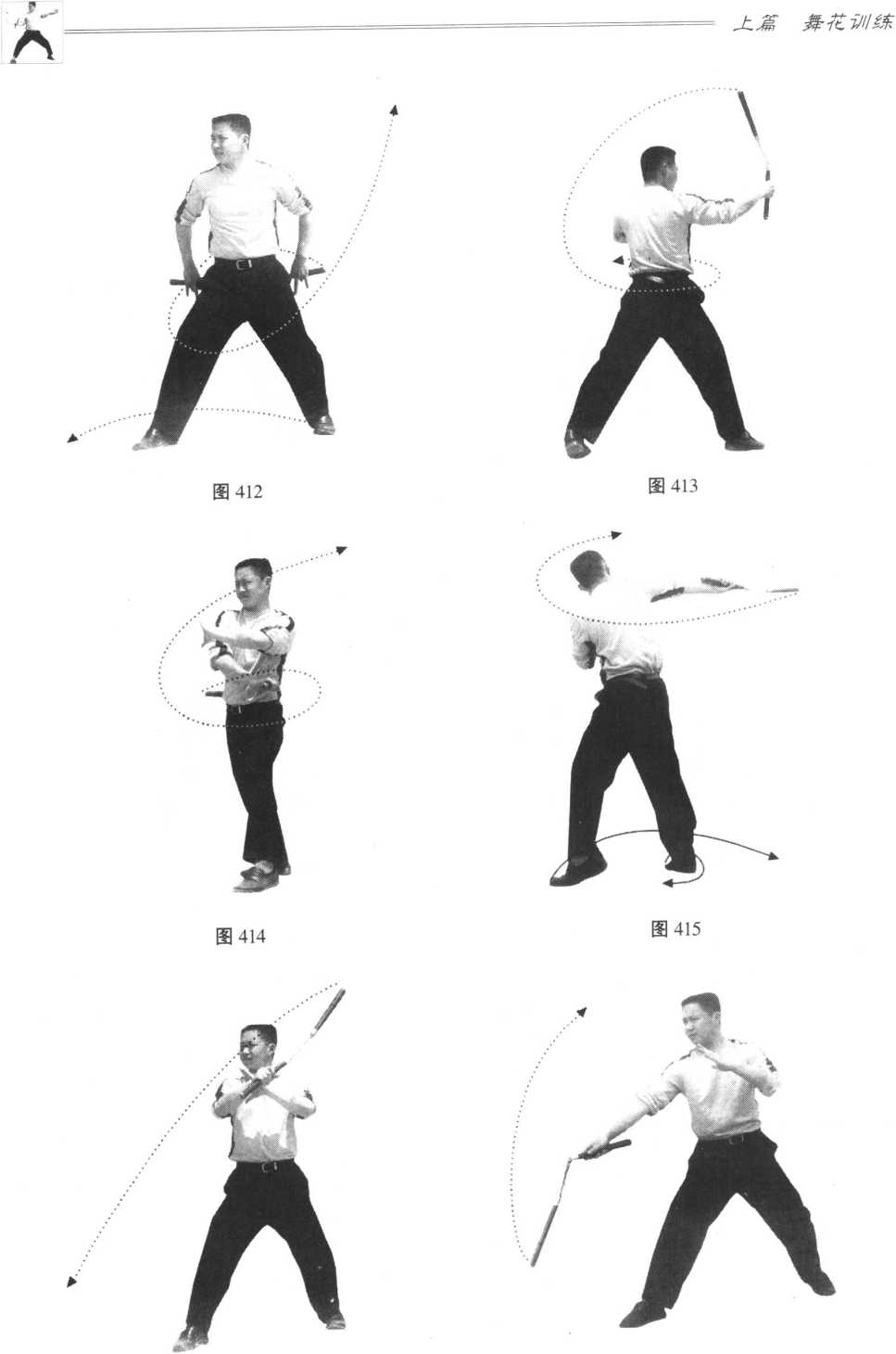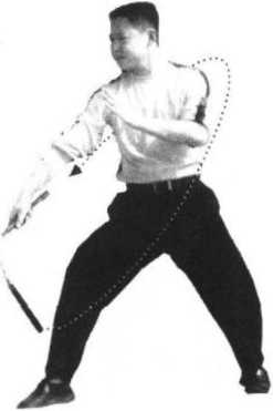 注释:动作的快慢及身体的吞吐开合,都具有相应的节奏和时机,经过严格训练的 两节棍高手,其动作不仅富有韵律和美感,而且能自如地加快和减慢动作节奏。此套动作 训练,如能有意识地去体验身体、步法、棍法的节奏,则能快速提高研习者对控棍时速的 感知力。