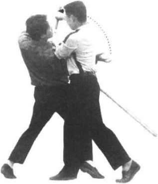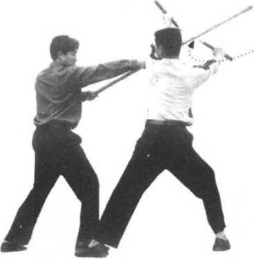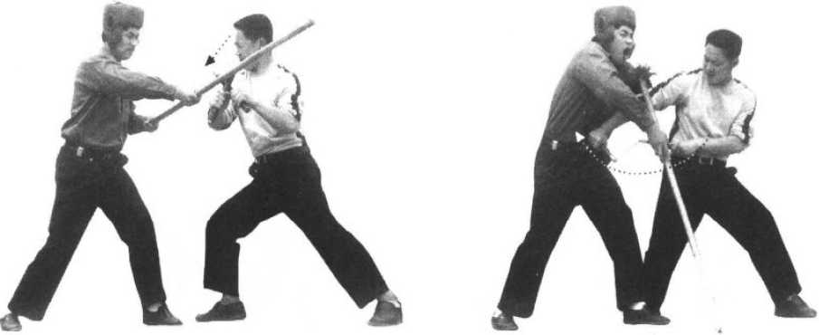 (2) 随即近身以右手棍端横击其面部。
