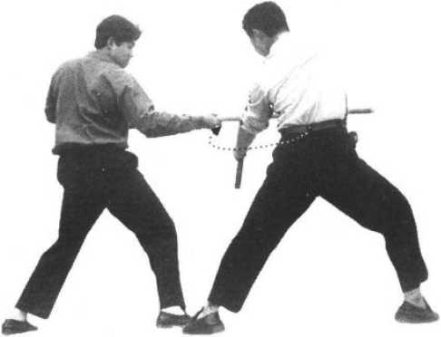 (1) 敌以棍端刺戳我中上盘时,我左闪的同时,右手在上,左手在下以棍链向右侧推 挡敌棍,使其偏离方向。