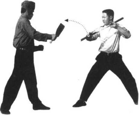 1 .以斜把拉棍势与手握利刃的歹徒对峙。