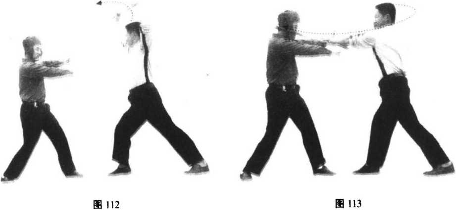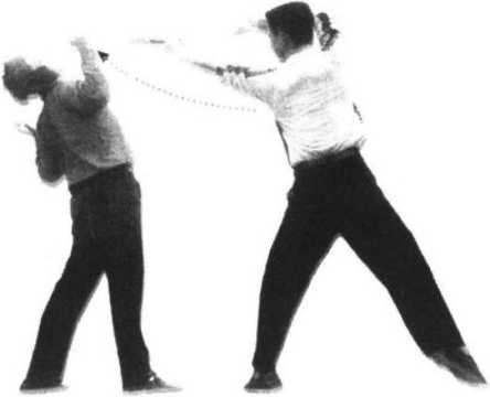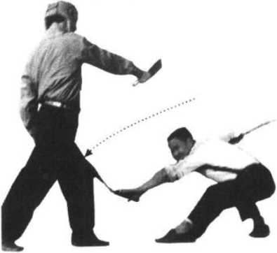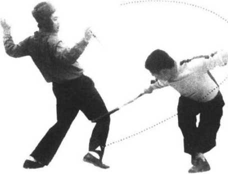 2. 我快速晃动前手,佯击对方上盘要害,敌慌乱中持刀斜劈我头部,我迅速右后转 体,以一记右手旋身后扫棍击其腿部-