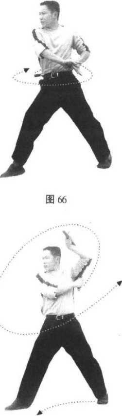 2,松开右手,左手反把向右侧平扫,至腰侧卸力反弹(图67);