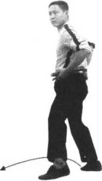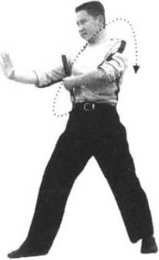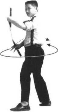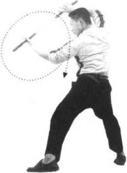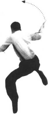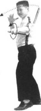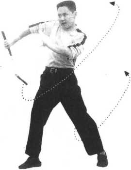 1 .接上动,右脚向前进步,身体迅速左后转动,同时松开左手,右手运棍随身转之 势在头顶旋扫(图73);