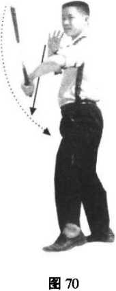 4 .左脚向左前斜移步,同时松开右手,左手反把运棍在体前做正流星赶月舞花,当 游离棍运行至右下方时,以右手接住(图69 ~ 71);