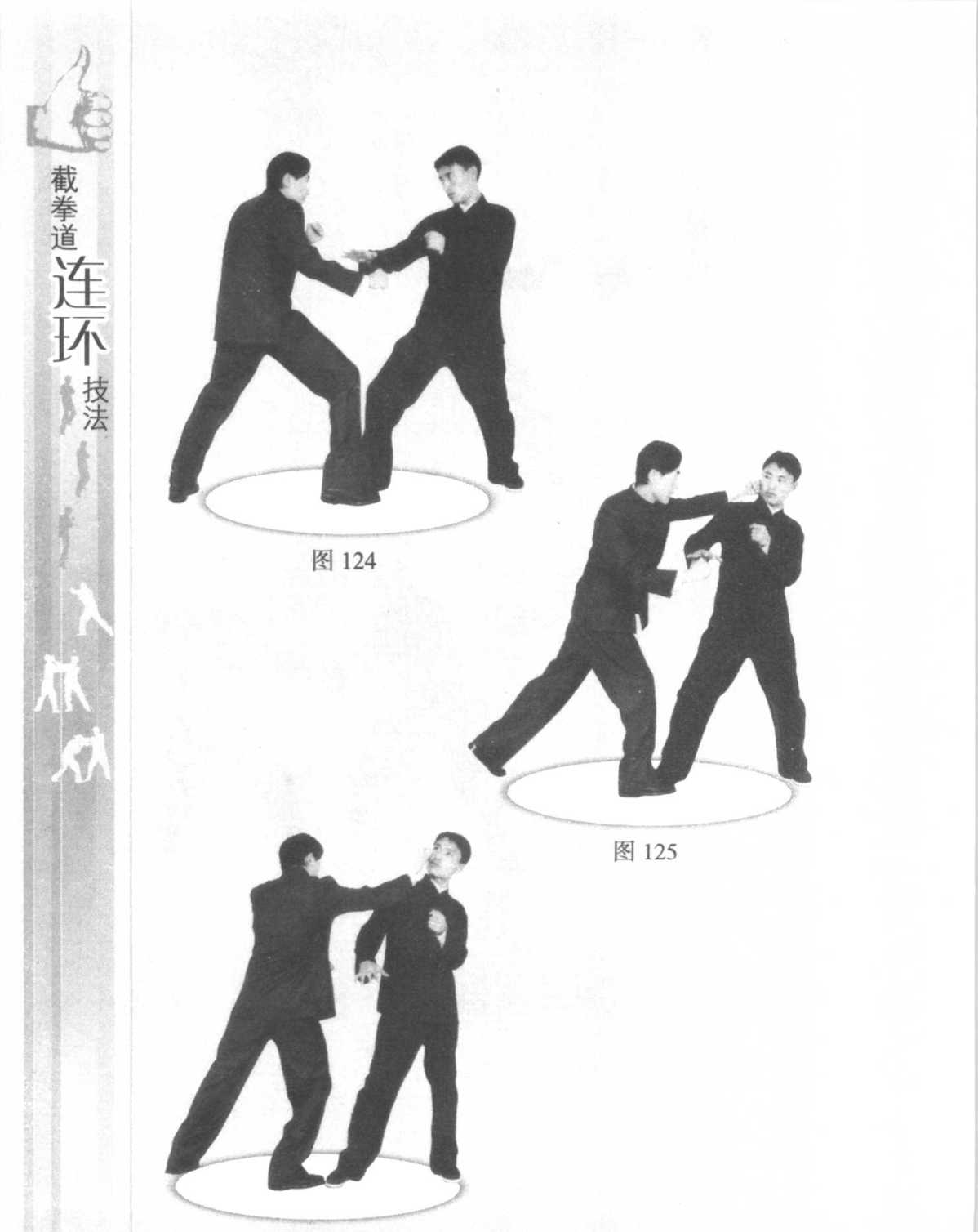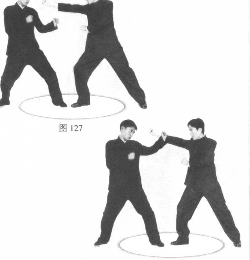 对手两手下落进行防 护,我方进步贴近对手,后手抄过对手防护,突然以摆拳 重击对手头部。对手被击晃闪时,我方紧接着以前手背拳 再捶击对手面部(图122 ~图126 )o图126图128图128AIMAIM图128图128AIMAIM