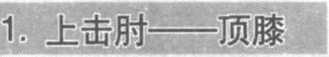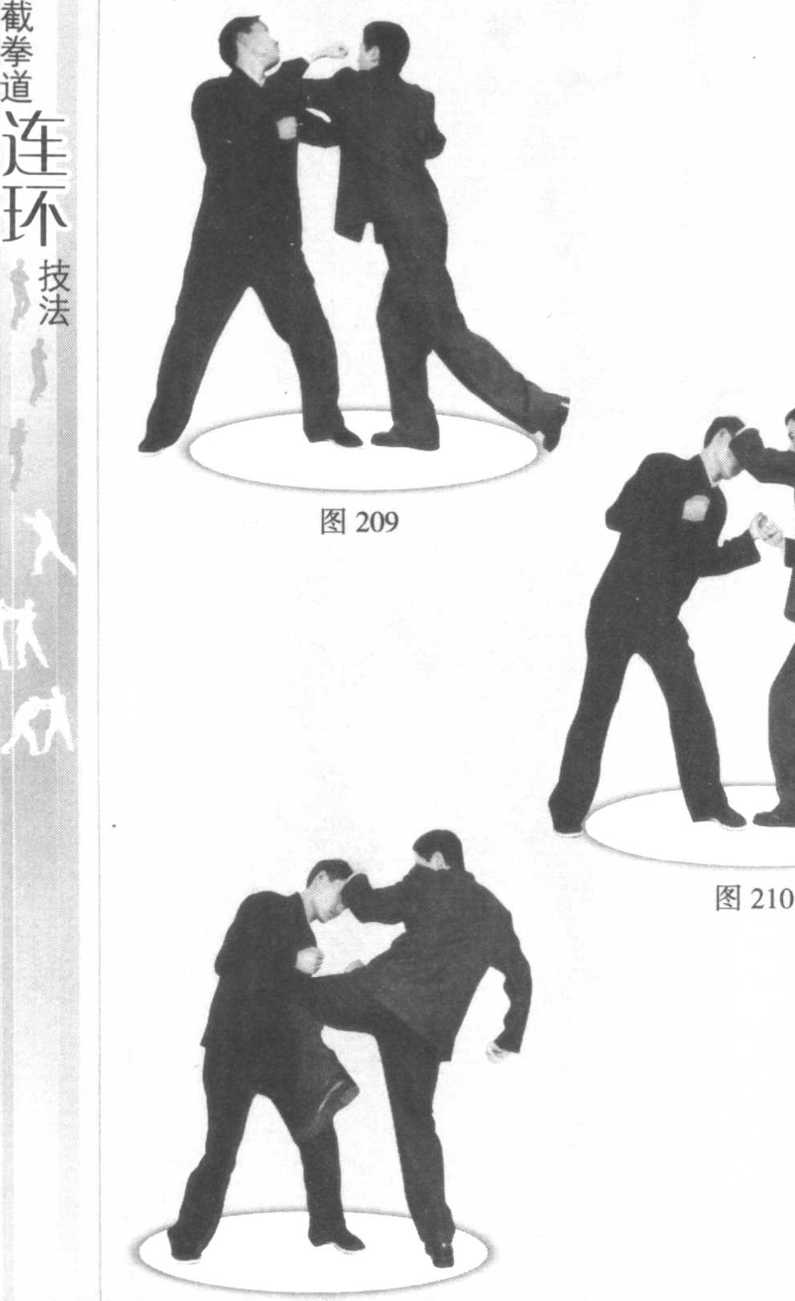 对手以左脚在前时,我方前手扬起,分散对手注意图207图208力。对手进行阻挡时,我方移步靠近对手,前手刚收势, 后手屈肘猛刺对手头、颈部。对手被击俯身,我方紧接着 用前手压按对手头、颈部,后手进行防护,后脚猛然提 起,膝顶对手胸、肋部位(图207 ~图211 )o图211图212