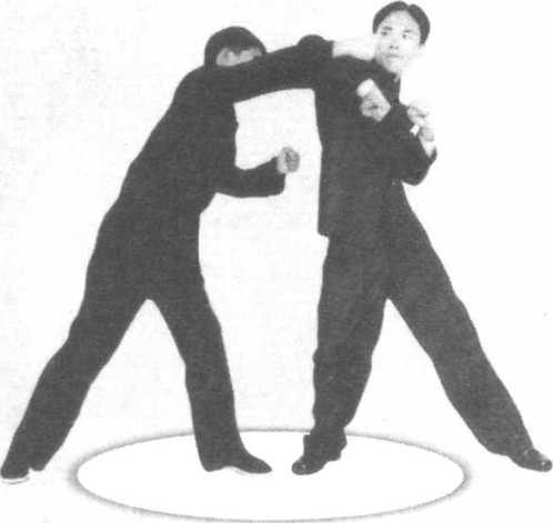 对手收回手,欲搂摔我方,我方迅速两手屈图263图264肘,外拨对手手臂,前脚提起,迅速撞击对手腹部。对手 遭到还击被迫后退,我方收脚并稳固身体时,前脚抡起, 猛然砸劈对手头、颈部位(图263 ~图269 )o图269