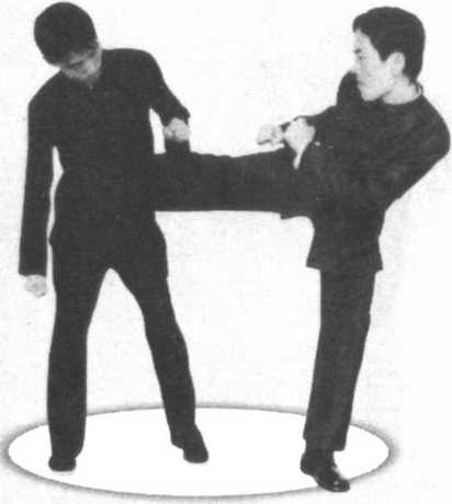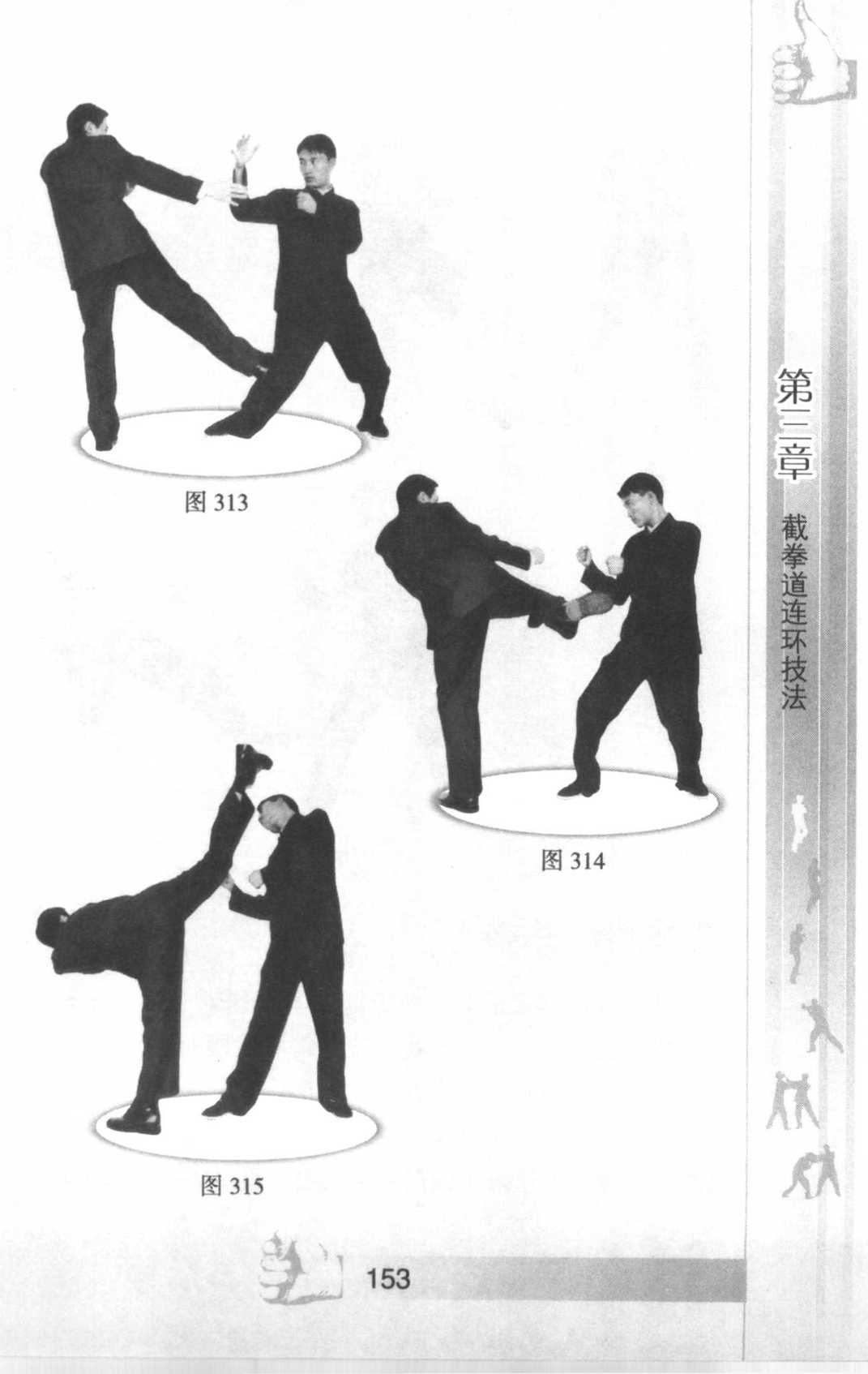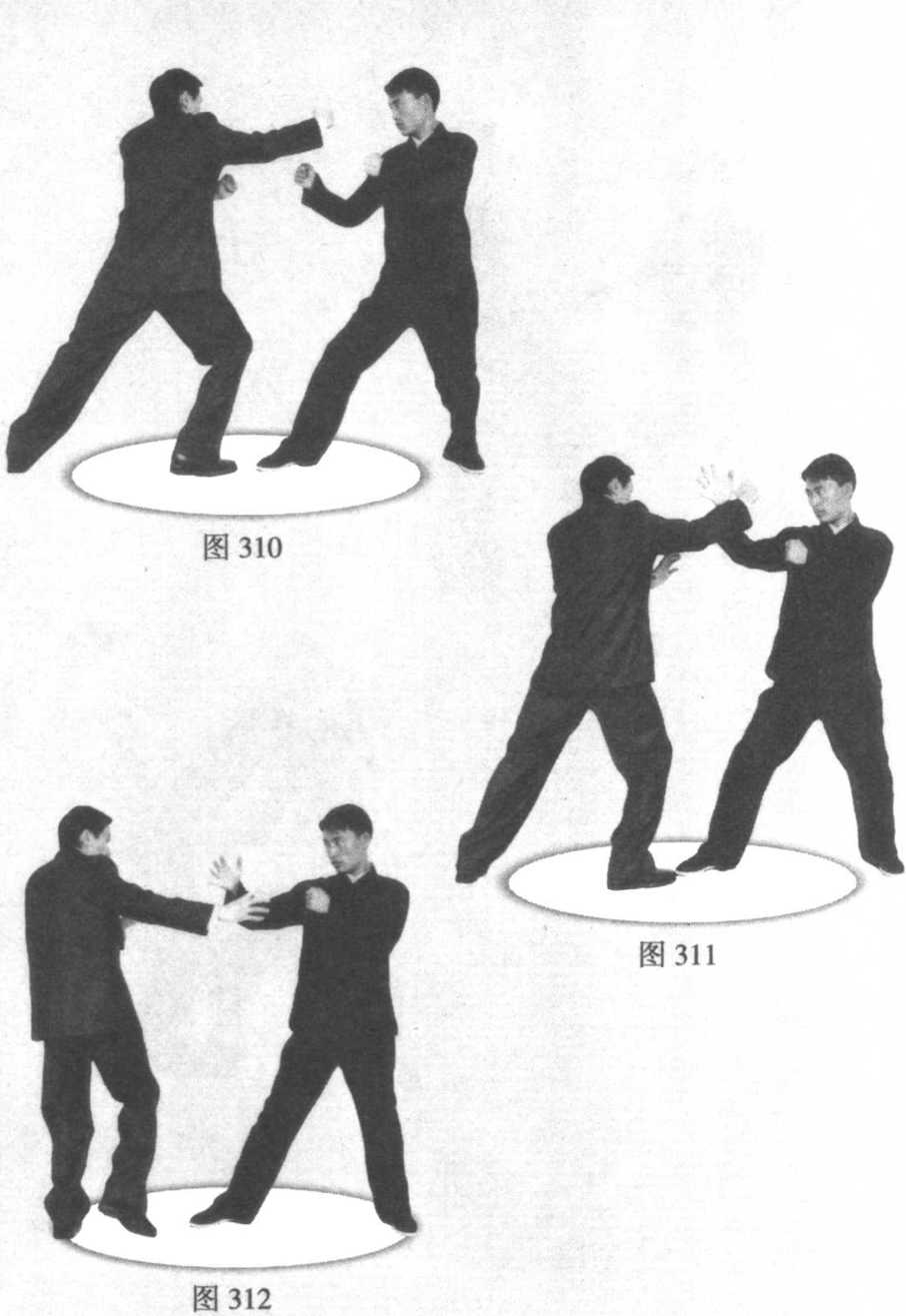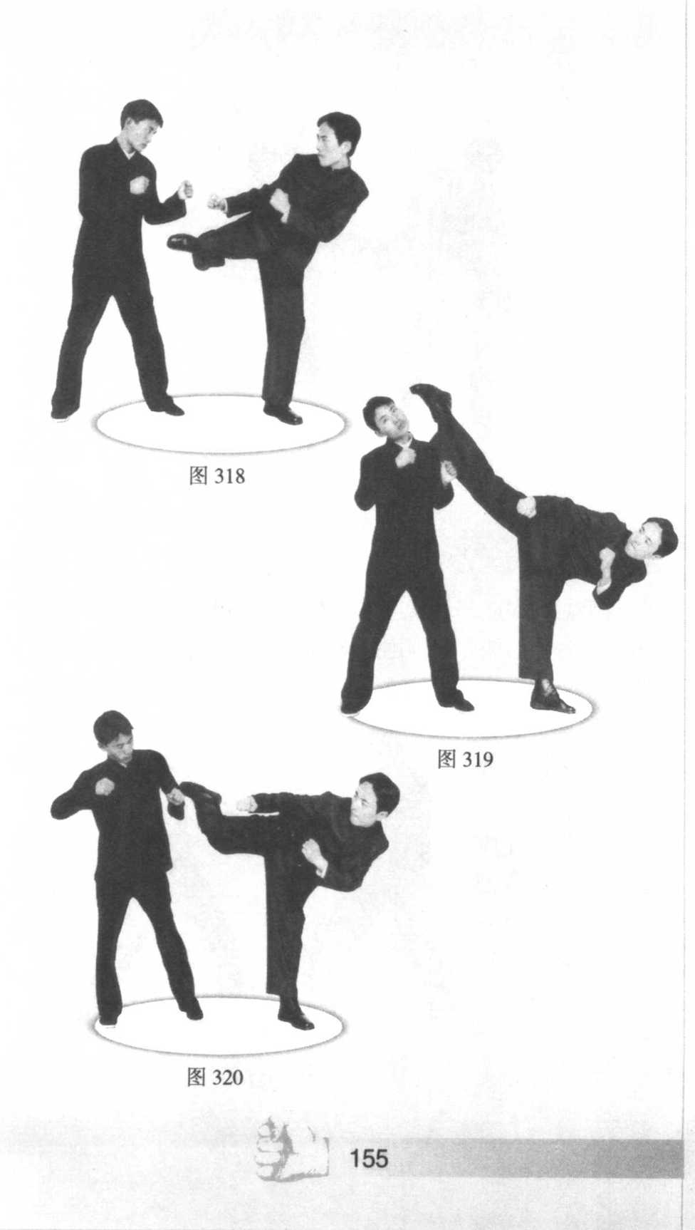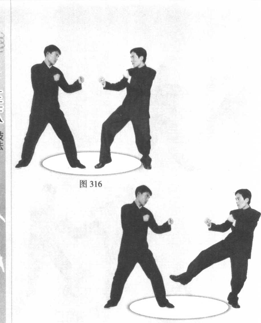 膝、腿部。对手欲收脚后退,我方侧踢,接着向对手头、 颈勾踢,击中对手头部或颈部(图310 ~图315)。