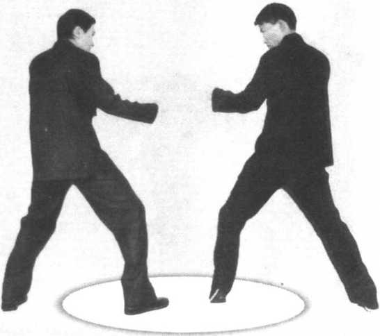 对手以右脚在前时,我方挥拳攻击对手面部,迫使对 ' 手前手格挡防护。但我方挥拳并不做重击,而是等xd*手出 手防守时,我方立即收拳,紧接着前腿快速出脚侧踢对手 G