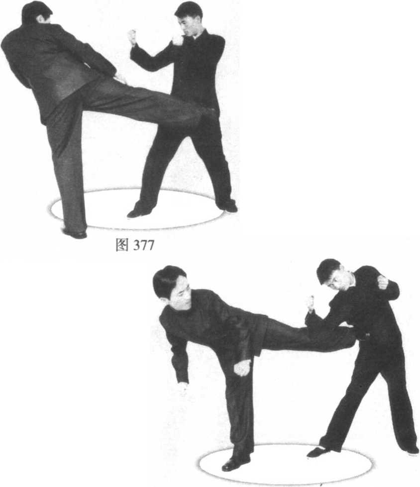 对手左脚在前并扑向我方,我方密切注视对手变化。□□图380图380截 拳截 拳图379图379□□图380图380截 拳截 拳图379图379当对手欲接近我方时,我方挥击佯阻对手。对手略迟疑, 我方未收回前手,前脚已强有力地截踢对手膝、腿部,迫 使对手停止前扑。紧接着未等对手做出反应,我方不收 脚,猛然提膝突破对手两手防护,重力侧踢对手头、颈 部。对手被突然击中而无力防守,我方紧接着又出前脚侧 踢对手腹、肋部位,踢倒对手(图379 ~图384 )o图385
