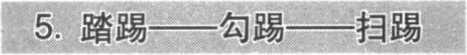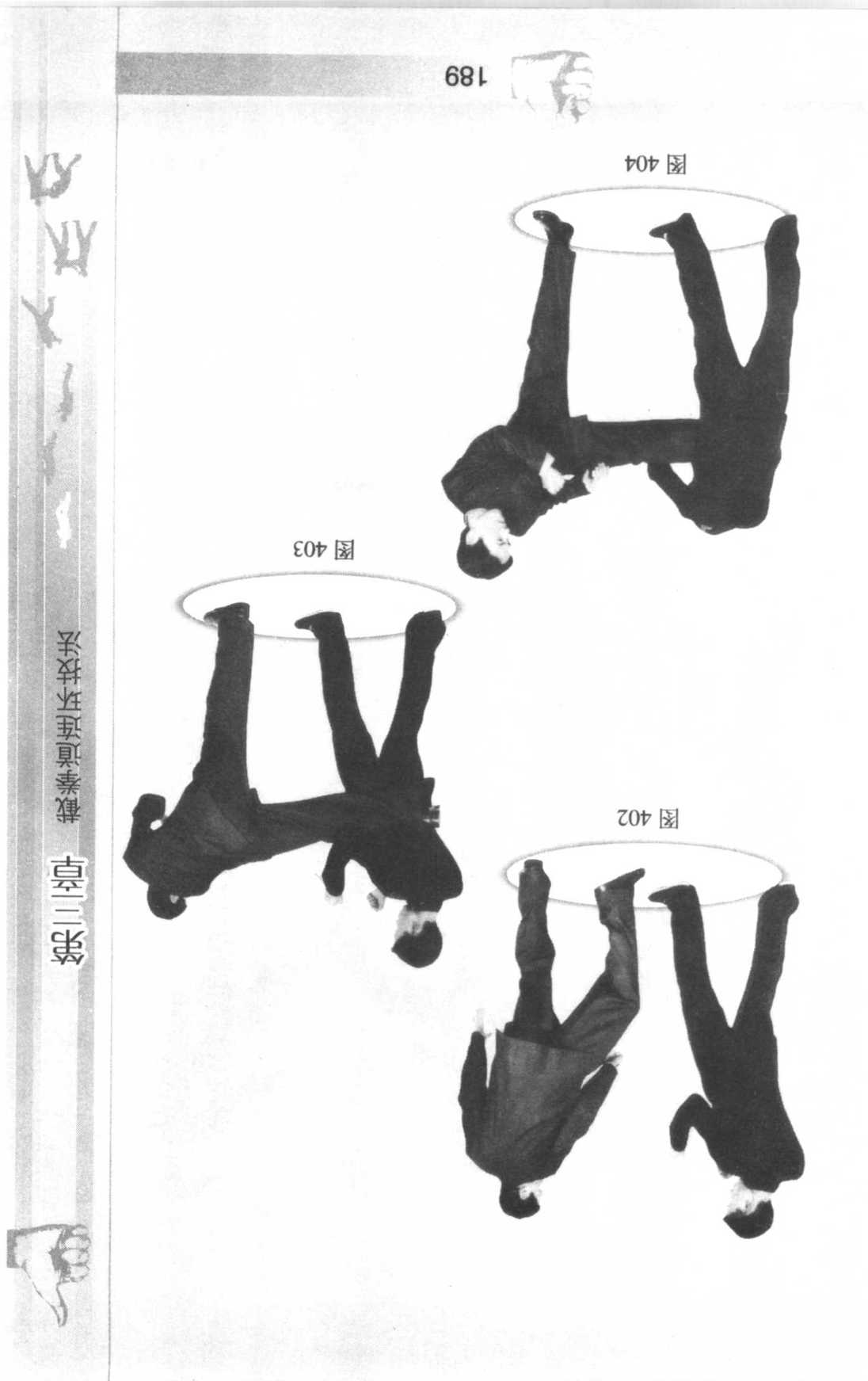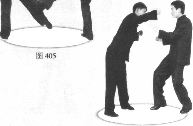 对 手后移步闪躲,我方滑步跟进,扬手吸引对手注意力。对 手严密防护身体上段时,我方右脚碾地,左腿猛然摆踢对 手腹、肋部位。对手被踢而站立未稳时,我方不放松攻 击,左脚落地,右腿抡起,重扫摆对手腰、肋部位,踢倒 对手(图400~图404)o图406