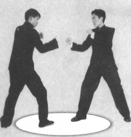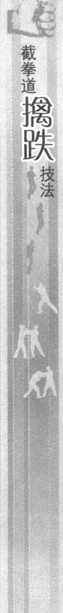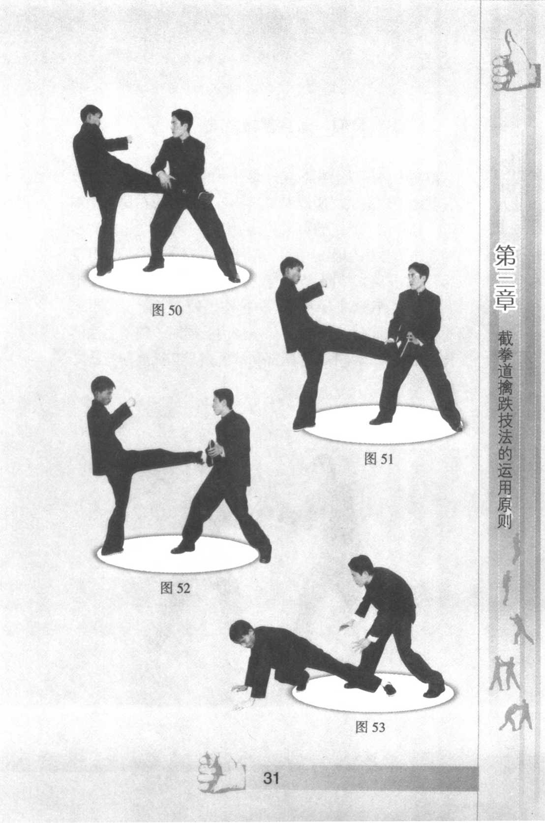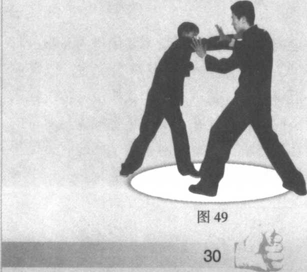 由警戒桩式与对手对峙。对手欲以右脚踢打我方(图 49),我方先迅速屈肘封住对手,或以肘、臂格挡对手 (图50),再顺势锁住对手脚、腿(图51 )。此时我方下肢 已经换步移动扣住对手踢出的腿。这一过程,已使我方做 到了招式的上下相随。在对手被擒住的同时,我方两手用 力拧翻对手,迫使对手被击倒(图52、图53)。图54图54图54图54