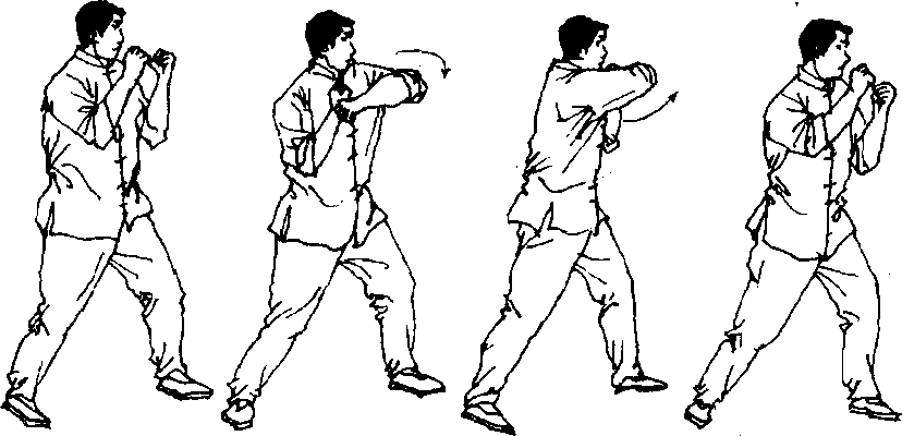 实践者必须保持警觉与肌肉的适度松弛,屈肘击打时,要 借助拧转腰劲力,动作要连贯、流畅。