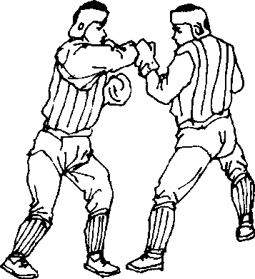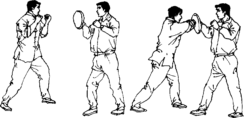 实践者在助手配合下进行训练,实践者与助手均着护具, 以实践者进攻、助手防护的要求练习,提高实践者平击时技 术,练习2?3分钟为一组(图477)。