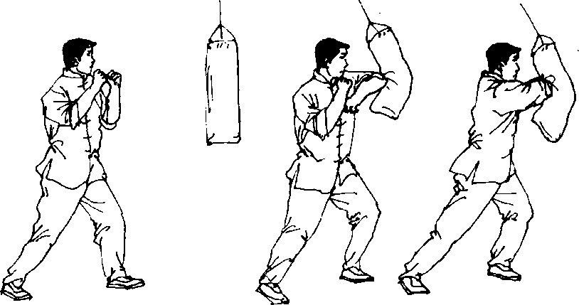 (2)实践者由移动中出肘攻击摆荡中砂袋,要求同(1),练 习30?60秒钟一组(动作均由警戒桩势开始和结束)。