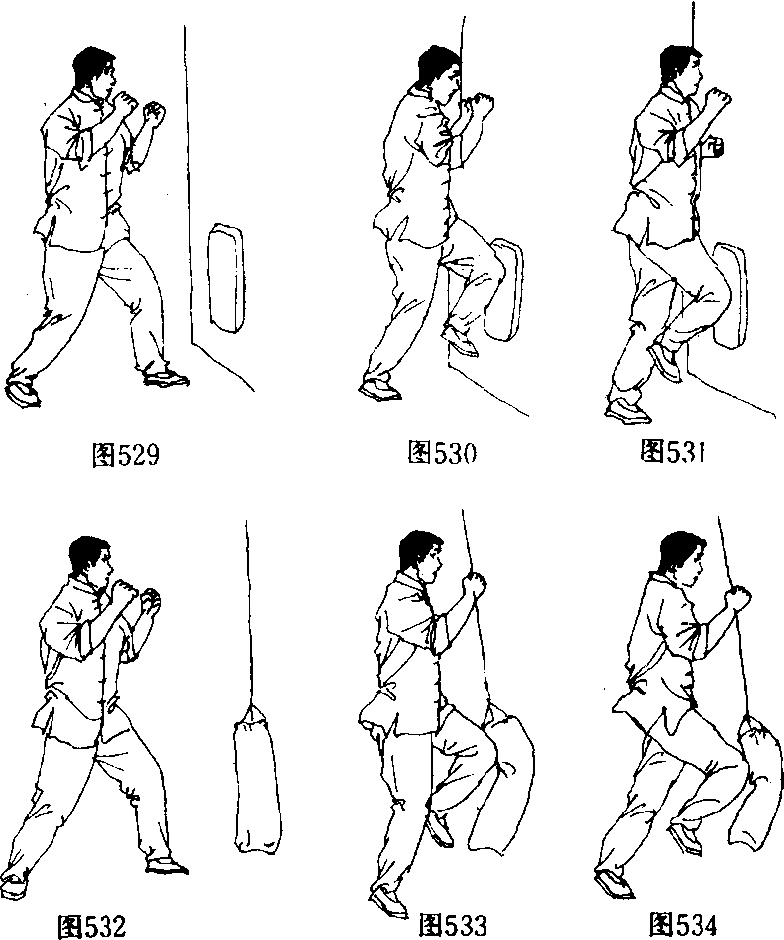 实践者选择小型砂袋(10?15公斤)或重型砂袋(100? 120公斤),进行剌膝练习。练习2?3分钟或100?300次为 一组(图 532—图 534)。