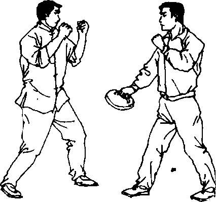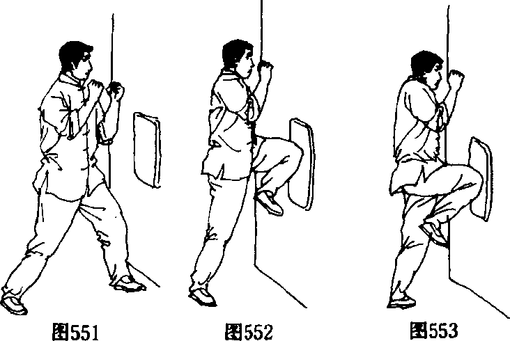 实践者通过固定耙练习来提高顶膝技术。练习100?300 次为一组或练习2?3分钟一组,练习时可先由静止中练习, 然后在移动中完成动作,逐渐提高顶膝速度(图551—图 553) 0