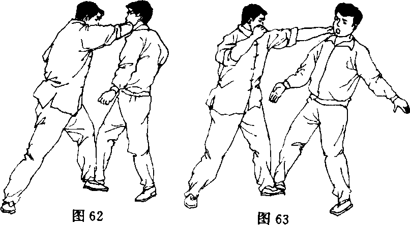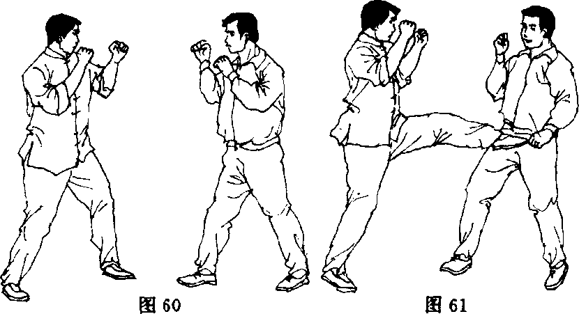 【动作说明】实战中,对手前拳猛击时,实践者后手挡抓对手前臂、前 手翻背拳攻击面部,紧接前劈掌攻击对手肋部(图57—图 59)。[动作要领]实践者移步、挡抓要同时进行,挡抓要准、快、牢固。前手 技术变换要迅速、轻巧、击打部位要准确。图57图58图59图58图592 .踢裆劈颈【动作说明】实战中,实践者抢前前踢对手裆部,肘击对手头部,在对 手受击身体摇晃同时,实践者前手劈掌攻击对手颈部(图 60—图 63)。【动作要领】前移前踢与肘击,要上下动作协调一致进行。劈掌攻击对 手颈部要准狠。
