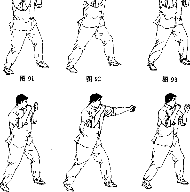 1 .由警戒桩势做剌拳动作,前臂放松似弹簧般的快速击 出收回,动作要短促、轻快、直接(图91—图93)。