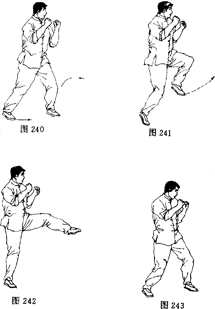 【动作说明】由警戒桩势开始做前踢动作,后脚向前滑步移动至前脚 内侧,后脚即将触及前脚时,前腿提膝借身体猝然动作弹劲将 脚踢出。劲力直达脚尖,脚背部或脚前掌,脚后跟部均可(图 240—图 243).【动作要领】快踢快收,迅速恢复警戒桩势,准备再次迅速前踢。