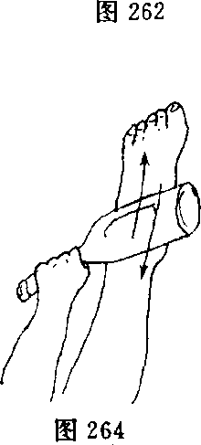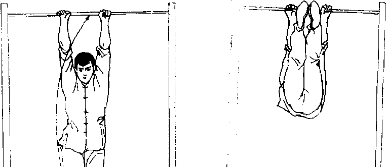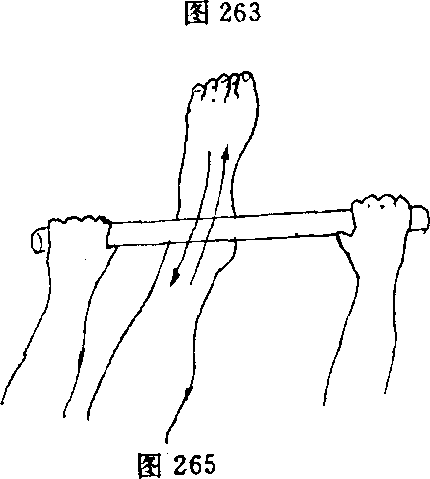 选用圆形光滑的木棒或铁棒、滚压实践者胫骨、脚背部 位,用力要由轻渐重,练习一定要量力而行(图264、图265)o也可用小型条状砂袋,由轻到重捶打脚背和胫骨。捶打2 ?3分钟或100-500次为一组。(4)悬垂举腿练习实践者双手分抓单杠或肋木,双手间距约与肩宽,全身放 松,快速用腰腹力量将伸直的双腿上举触杠(图266、图267)。练习50?20。次为一?组。图266图267图266图267