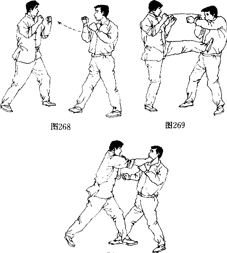 实战中,对手移步以后手摆拳击打实践者上体时,实践者 前脚踢对手太阳神经丛,随即拳击对手面门(图268—图 270)。