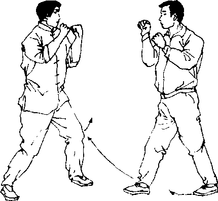 此是利用对手发摆拳时暴露出的腹部空当进行攻击的方 法。在运用中,只要前踢能快速踢中目标,即可制止对手攻势, 为拳击创造条件。