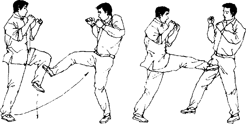 实战中,实践者前腿提膝防护对手前踢,当对手收回前脚 瞬间,实践者用后腿前踢对手裆部(图271—图273)。