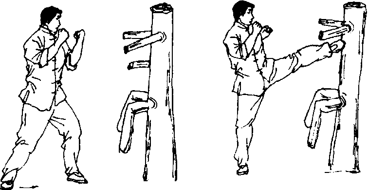 实践者可用木人桩练习,将此当做一名对手练习侧踢技 术。