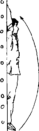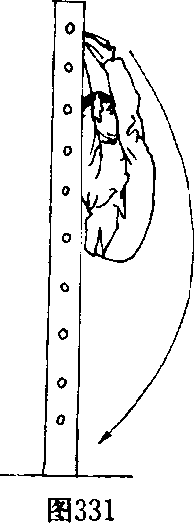 此项辅助练习,是为尽快加强实践者的腰腹力量,为拳技 精进奠定基础,此种练习在肋木高单杆上均可进行,实践者双 手分开与肩同宽握杠,放松身体以腰腹力量将并拢的双腿上 举触杠,连续进行练习(图330、图331)。