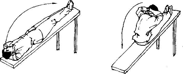 实践者在斜板上做收腹练习(图332、图333),当能够一 气完成10。次时,可将杆铃片置于脑后进行练习。
