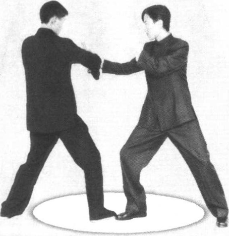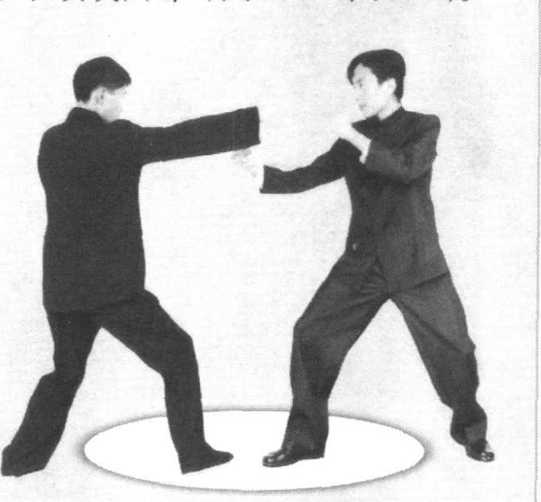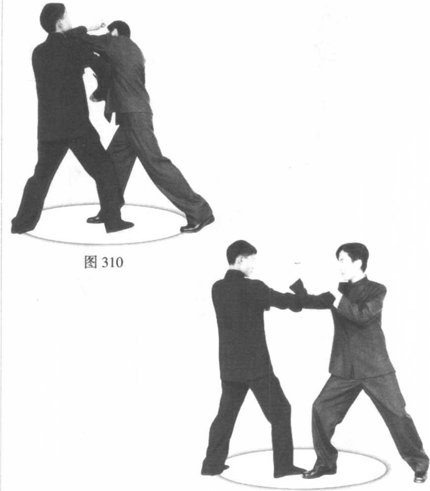 图309图309由警戒桩式起做上击肘动作。对手以右脚在前,并以 右手挥击我方,我方快速抬起前手以阻挡对手的攻击手 臂,同时快速移动近身,右手收回防守身体中段部位,左 手猛力挥肘,刺击对手下须或面部(图308?图310 )。