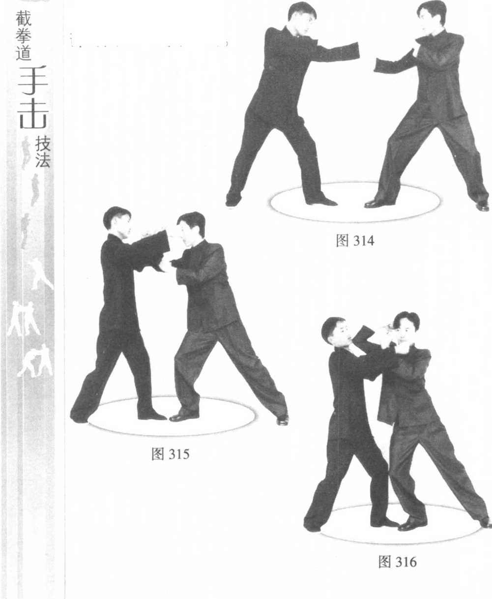 由警戒桩式起做上击肘动作。对手以右脚在前时,我 方前手指戳突然进攻对手面部。对手被迫抬手格挡,我方