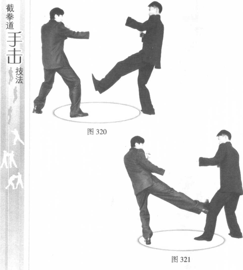 由警戒桩式起做上击肘动作。对手以左脚在前,并以 前脚前踢进攻。我方提膝阻挡,同时快速落脚移动,低段 侧踢对手膝部。对手前手下落进行防护,我方前手屈肘, 突击对手头部(图320 ~图322 )o