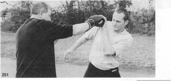 从格斗势开始。当敌人以刺拳攻击的时候你就用后手掌去抓握他的拳就像抓握棒、垒球一样。抓握的手应该在脸部前10-15厘米处。不要用手阻挡冲来的拳使其停止相反应该让手作为一个富有弹性的缓冲器来吸收敌人冲击的能量同时头部要向后略微躲闪一点儿(图251)