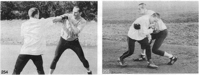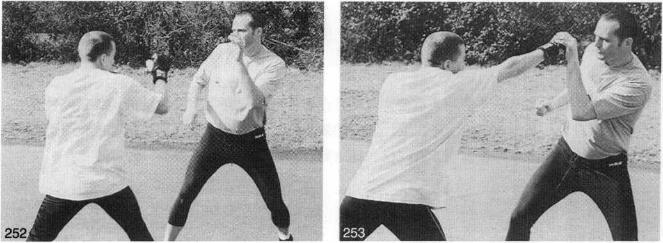 当你熟悉掌握抓握技术后就可以融入一些有用的格斗技术进行练习了。当敌人用快速刺拳进行攻击时你快速抓住来拳并以刺拳反击敌人随后进行搂抱(图252一图255)该动作主要在于时机的掌握随着进一步熟练还可以结合步法来进行练习。一旦你非常熟练地掌握了该技术后抓握和刺拳就可以同时进行了。