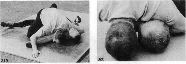 这是一种主流姿势。将你的敌人按倒在地使其背部朝下而你则用双膝支撑地面。用左臂搂住敌人的脖了右手臂伸开摆在合适的位置。手指伸开以增加与地面的接触面积。身体处于中线略向右侧偏斜的位置。用腿缠住敌人的腿(用你的腿将敌人缠住而不被摔下这一点至关重要)。将你的头置于敌人面部的左侧(图319)。你还可以用左肩压住敌人的脸使他无法呼吸这样他就会很被动(图320)。